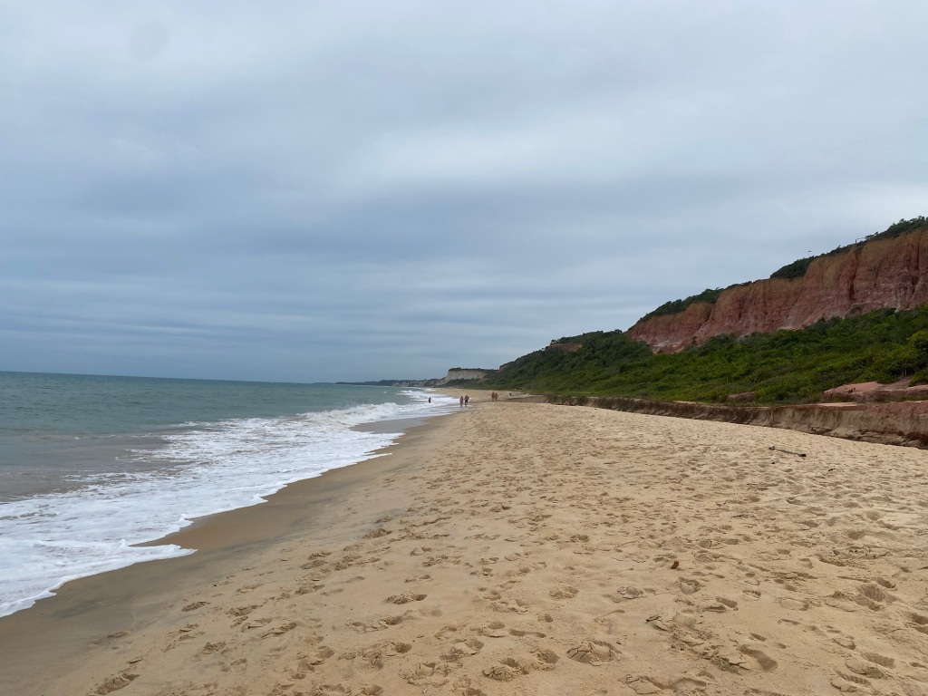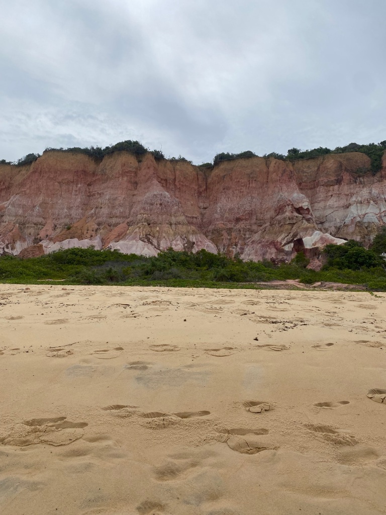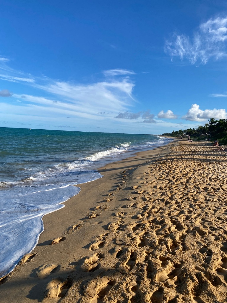 Beim Auspacken habe ich bemerkt das ich mein Badekleid in Arraial vergessen habe. Im Lonley Planet gelesen und André ein Reisender den ich schon in 2 verschiedenen Hostels getroffen hatte ( ohne whats app 🙂 ) die Strandwanderung gelaufen und geschwärmt hatte. Also entschied ich am nächsten Tag wieder mit dem Van nach Arraial de Ajuda zu fahren und von dort nach Trancoso 20 km zu laufen. Gesagt getan ich habs nicht bereut die Beachwalk abwechslungsreich zwischen Karibik, Felsen, Palmen, Meer, Sonne, Wolken, Beachtestaurant und Bungalows…ein paar Kilometer nur ich und 🎤meine Spuren im Sand die ich gestern noch fand hat die Flut mitgenommen….
