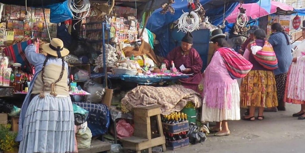 Spektakuläre und atemberaubende Aussicht auf die Stadt. In El Alto befindet sich ebenfalls der Hexenmarkt von La Paz, der Mercado de la Brujas. Jede Bruja, Seherin, Schamanin , weise Frau hat ihr eigenes Office, vor dem eine brennende Feuerschale platziert ist. Hier kann man sich die eigene Zukunft aus Kokablätter voraus sagen lassen.