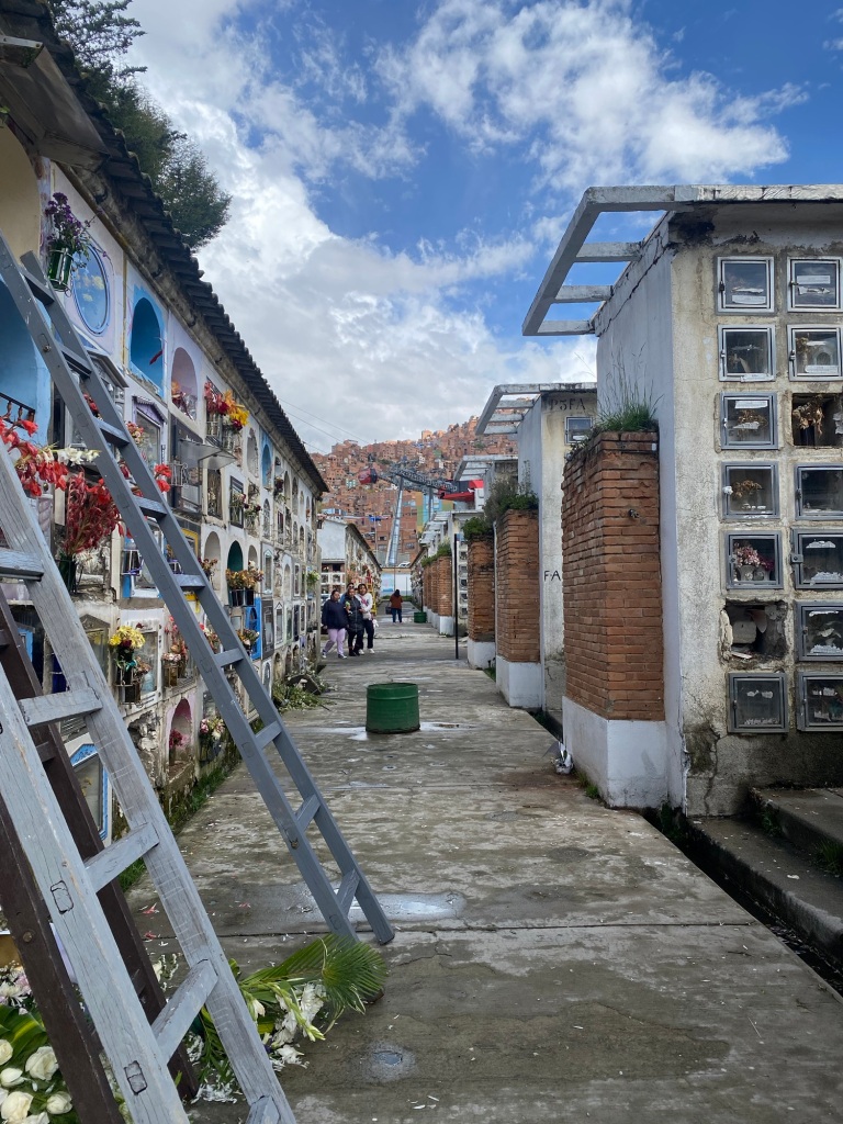 M: der Friedhof von La Paz ist sehenswert und riesig. Jeder Tote erhält ein „ Sarg – Schliessfach, welches in den meisten Fällen wie ein Schaufenster dekoriert wird, mit Hobbys oder Vorlieben des Verstorbenen um an ihn zu erinnern. Mit einem Foto oder Gegenständen, die der Person etwas bedeutet haben; ein Lieblingstier, ein Auto in Miniatur oder was auch immer.