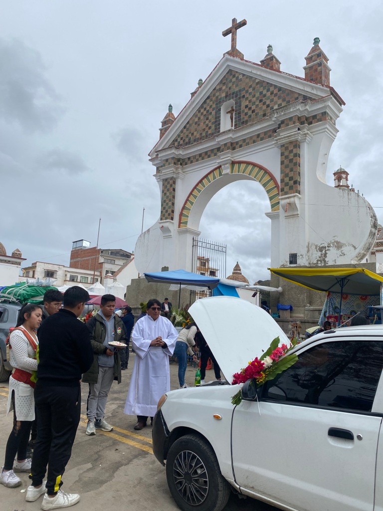 Jährliche Autosegnung durch einen Priester. Fahrer wollen sich und ihre Wagen so vor Unfällen schützen. An diesem Tag sind viele Halter nach Copacabana gereist. Die Autos werden für diesen Anlass geputzt und geschmückt mit Blumen und Girlanden.