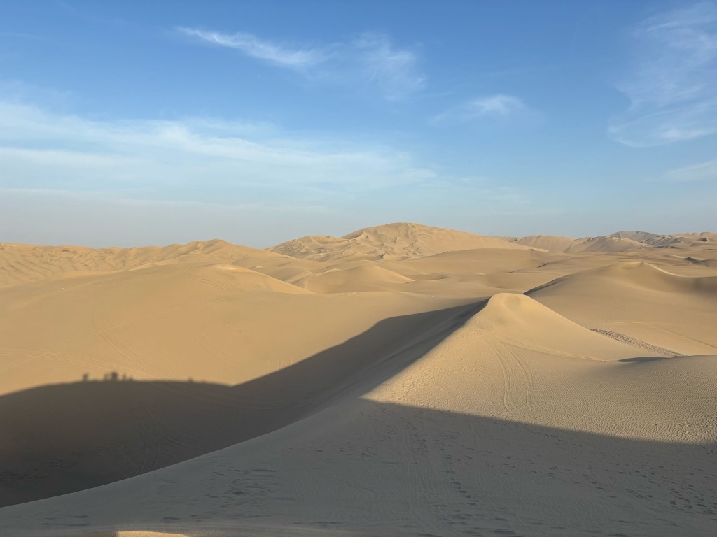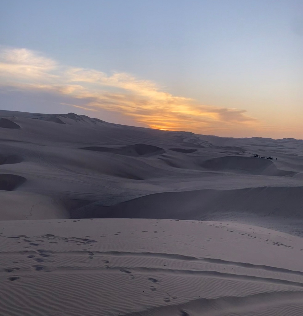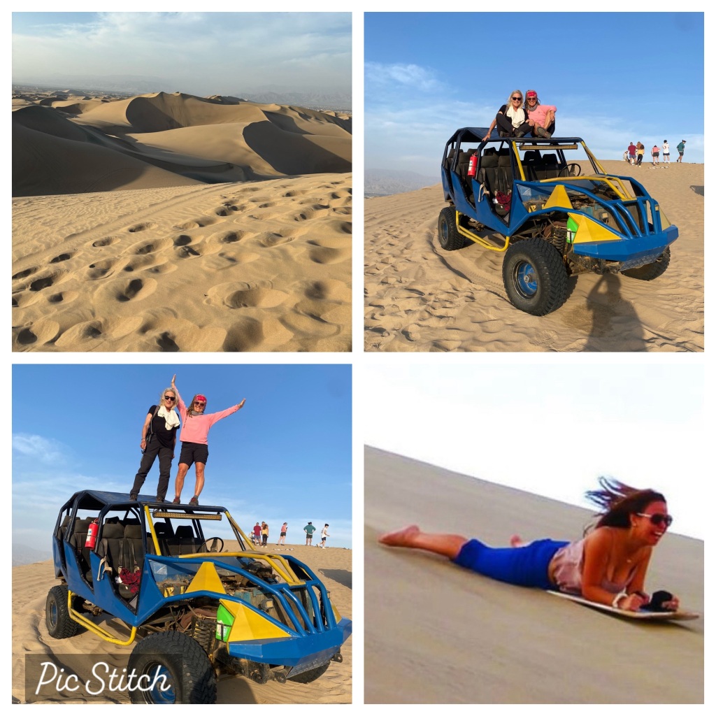 B: Die Fahrt mit dem Buggy war alles andere als entspannend, durchgeschüttelt und gerüttelt wie in einem Mixer. Das Sandboarding und der Sonnenuntergang in der Wüste hat Spass gemacht. Heute Morgen um 6 h unsere letzte gemeinsame Busreise in Peru zurück nach Lima ca 4h.