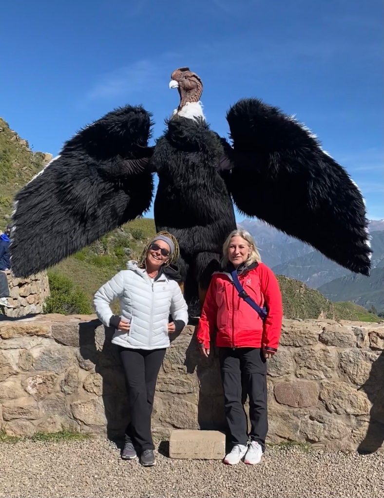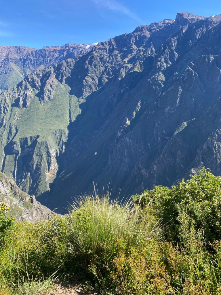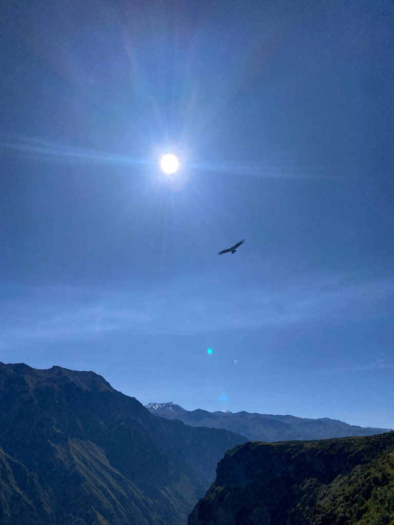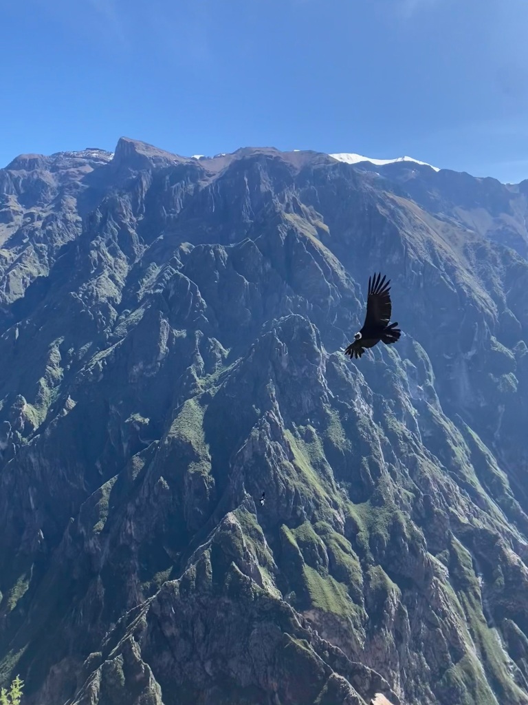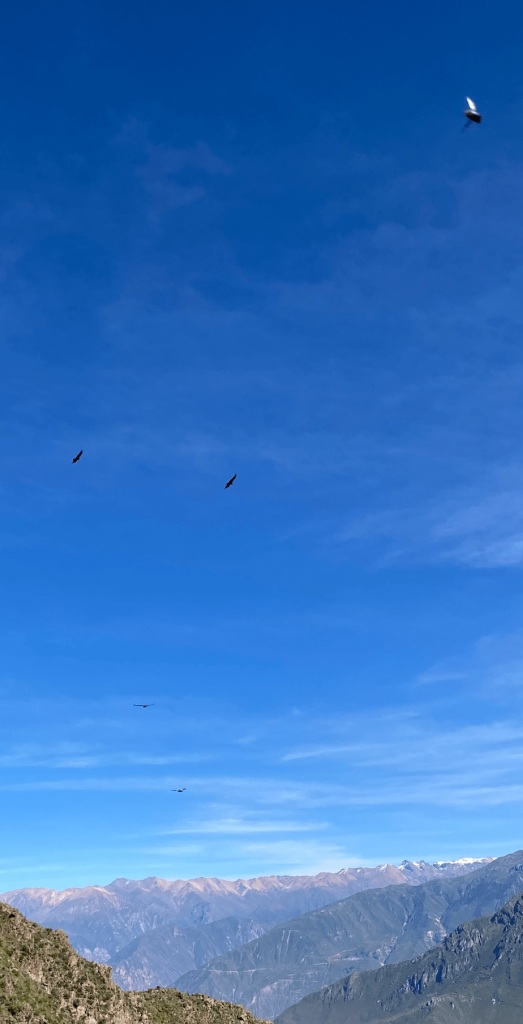 B: Dann nähern wir uns am Lieblingsort der Condore. Viele Besucher bewundern die Flugkünste der 8 Condore. Im Juli fliegen hier bis zu 40 Condore erklärt uns die Reiseleiterin. Bieten eine Show vom feinsten. „Ich glaube sie geniessen die Zuschauer. Denken sich was für eine komische Spezies, da zuschaut nicht fliegen kann.“🦅😄