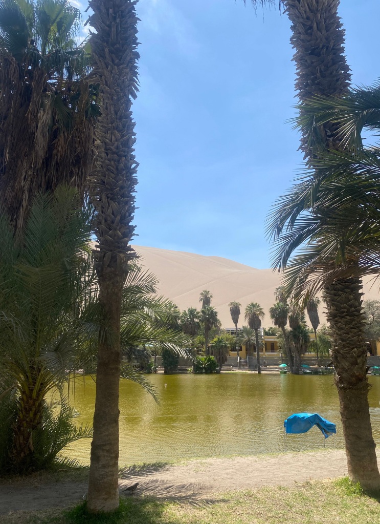 B: In Ica haben wir eine Parade der Gesundheit gesehen. Danach mit dem Tuck Tuck in die Oase Huacachina. Heute gibt es eine Wüsten Tour mit dem Buggy und Sandboarding.