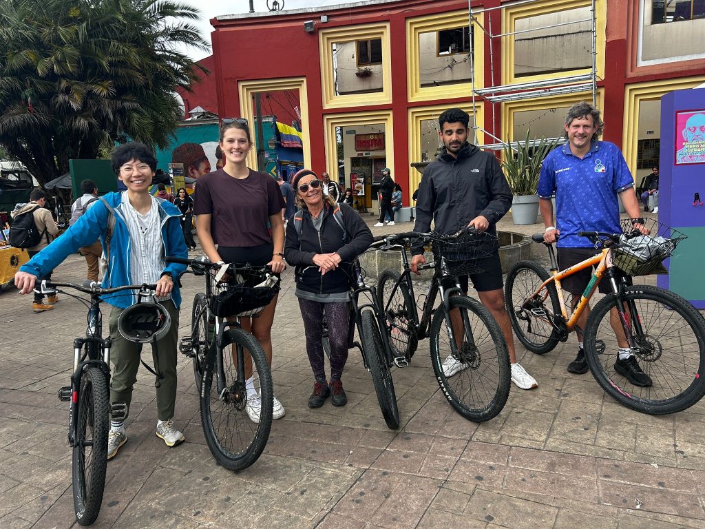 Am nächsten Tag eine Fahrradtour durch Bogota bekannt als Velostadt. Sehr beliebt Treffpunkt beim Bikeshop. 14 Personen aus vielen verschiedenen Länder bekommen ein Fahrrad. 2 Gruppen mit je 7 Personen 3 Schweizer mit mir, 1 Japanerin, 2 Engländer,1 Amerikaner werden von je 2 Guids durch die Stadt mit vielen Informationen zur Geschichte Kultur … Stopp in einer Kaffee und Kakao Rösterei und auf dem Gemüse und Fruchtmarkt probieren wir viele verschiedene Früchte. Unser Guide ist der Besitzer des Bikeshop. Sehen viel von der Stadt. Er weiss viel zu erzählen. Es war mega cool.